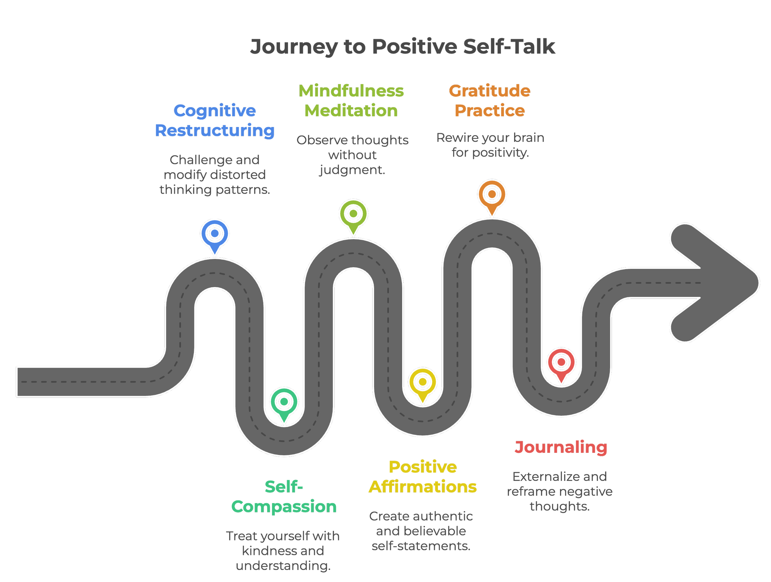Develop a repertoire of self-compassion practices that you can use when negative self-talk arises. Write yourself a compassionate letter when facing a difficult situation, imagining what a loving friend would say. Practice loving-kindness meditation by directing kind wishes toward yourself: "May I be happy, may I be healthy, may I be at peace."